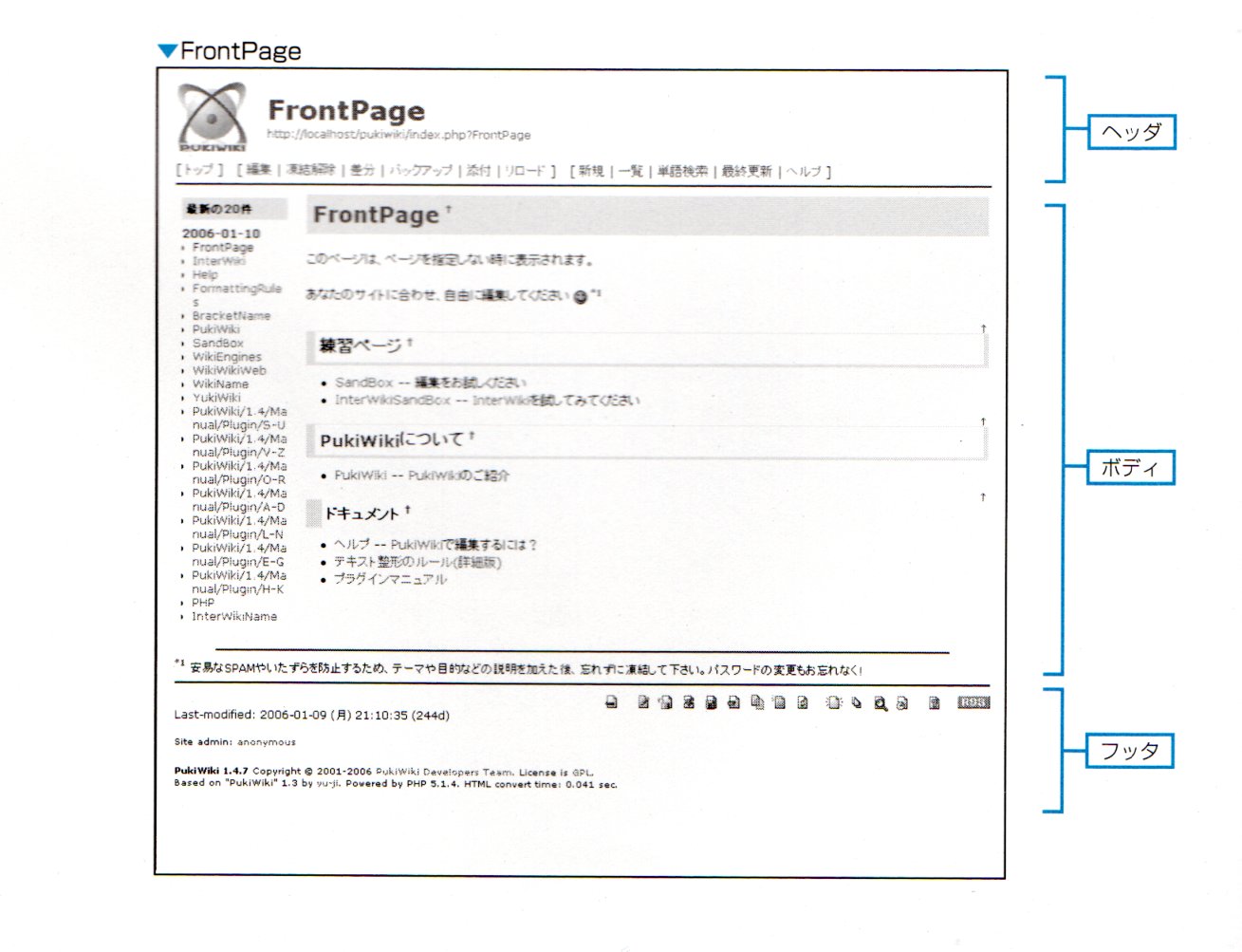 ヘッダとフッタの中にはPukiwikiの操作用ナビゲータ部が含まれています。