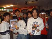 | 早くもKOF2002大会も第三回を迎え、いちだんと各キャラクターの研究も進み熱いバトルと成りました。なんと今回の大会では3連覇の声高いKBT氏をロイピ氏がヤブルという大金星をあげて、これにより一段と混戦となりました。この熱きバトルを制したのは初参加のたぶ〜ん氏でした。これにより次回大会ではたぶ〜ん氏目指せ2連覇。KBT氏の王者復活なるか!次回の大会も目が離せない!!(大会担当スタッフ:瀧口) |
