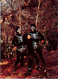 突然、ジャガーマンが二人の前に現れた。「お前は、ショッカーの怪人だな」本郷は言った。「きっと、お前を殺してやる。覚悟していろよ」そう言い残すと、ジャガーマン達は、素早く、茂みの中に姿を消してしまった。「敏捷な強敵だ!」本郷はうなった。 |