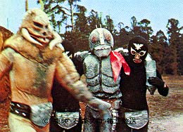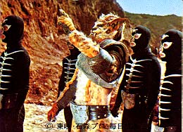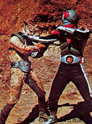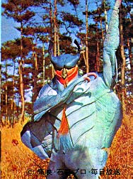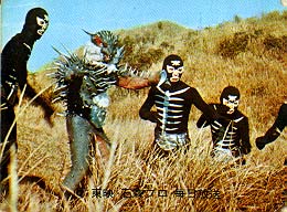 不気味な風に吹かれる草原に、見よ!ハリネズラスとショッカー戦闘員達だ。ここでこれから、世にも恐ろしいショッカー式死刑が行われようとしているのだ。頑張れライダー、ショッカーを倒すことが出来るのは、お前だけなのだ。 |