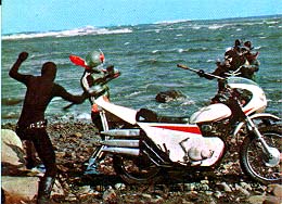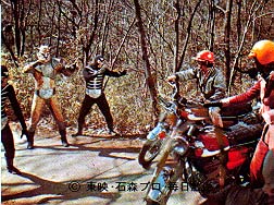 モトクロスレースの優勝を目指して猛訓練中の本郷猛。ジャガーマンは、それを見ながら、戦闘員達に命令している。「初めはお前達だけで戦え!最後の息の根、この俺が止めてやる」と、ジャガーマンは、不適に笑う。 |