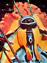 目がプリズム・アイ。口から毒ガスを吐く。首に巻き付けた蛇は15mものび、相手を絞め殺す。 |