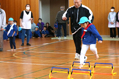 「がんばれー」かわいい声に高齢者は背筋をシャキッと伸ばし大張り切り!「可愛い頑張って!」とお返しの応援に子供たちはにっこにこ。温かい雰囲気に包まれた時間は楽しかったでした。