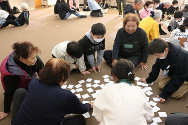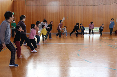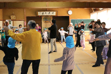 保育園の年長さんとコツコツ体操の参加者がつながリズム体操を実施しました。体操は前後や左右の動きで、普段使わない動作に高齢者はニコニコ顔。いっぱいの笑いの中に、いろんな繋がりが生まれた楽しいひと時でした。