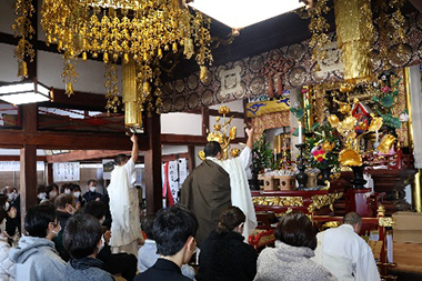2月15日畔屋萬福寺で厄払いと水行祈祷会と団子まきが行われました。昨年まで都合により予定があちこちに移動していた行事を今回ひとつに纏められ、約60人の参列者でお参りしました。団子まきでは地域の子供たちも参加して、多くのお菓子や福豆・団子を拾って無病息災を祈りました。