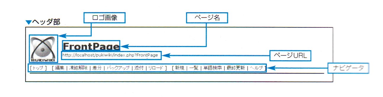 ヘッダとフッタの中にはPukiwikiの操作用ナビゲータ部が含まれています。