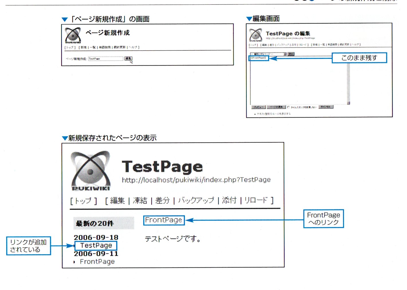 見やすく情報が管理されたWebサイトを作るためににはテーマごとにページを作成する必要がありますが、Pukiwikiではページを作成するのもWebブラウザからの操作のみで簡単に行えます。