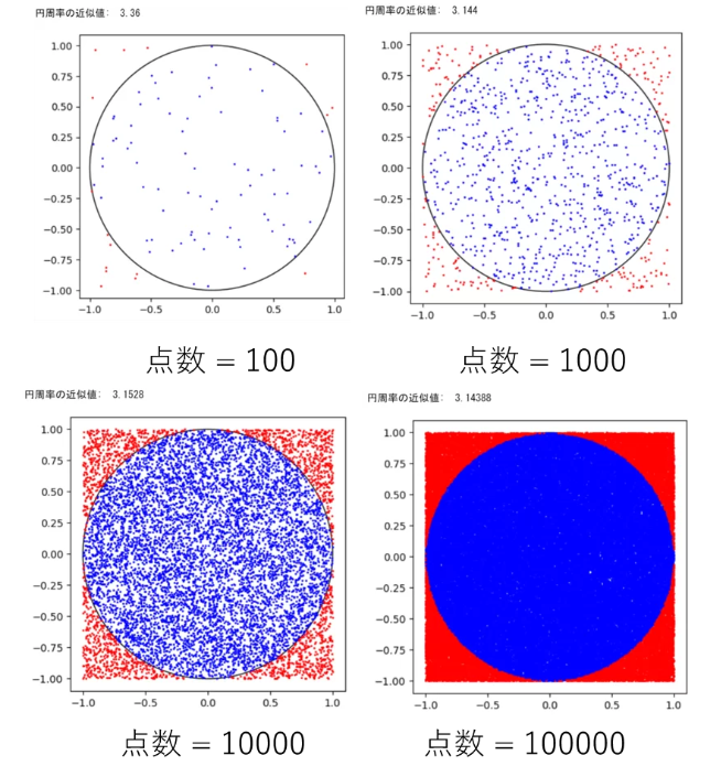 以上がモンテカルロ法を用いた、πの推定方法となります。