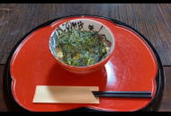 珍しいお雑煮のランチです。具沢山のお汁に、店主の搗いたお餅と江戸時代から有名な笠島の岩海苔、どうぞご賞味ください。ランチには、ちょっとした魚料理と果物が付きます。