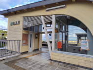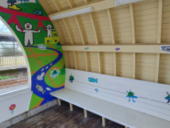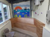 米山小学校の児童さん達の素敵な絵、海側待合室の大きな窓とベンチ、是非ご覧ください。新しい笠島の観光スポットです。