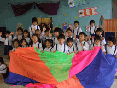 大方の予想に反して、むしろ園児 が何の抵抗もなくにこやかにのびのび接していたのが印象的でした。 きっと、子どもの人を見る能力はすぐれていて、瞬時に自分を愛しているかどうか峻別できるのかもしれませんね・・・・。 お土産として大きくて色鮮やかな「パラシュート」を頂きました。 |