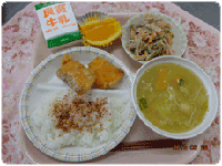 ふりかけご飯、鮭の竜田揚げ、ごぼうサラダ、南瓜のみそ汁、牛乳、オレンジ