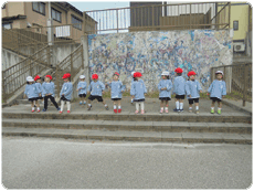 年少組は幼稚園周辺をお散歩しました。 交通安全の話を聞いてからお友達と手をつなぎ出発です。