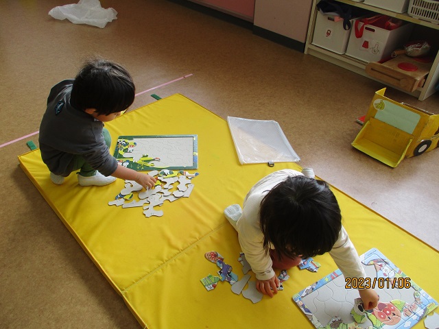 お正月あそびのこままわしやカルタとり、パズルも楽しみました。