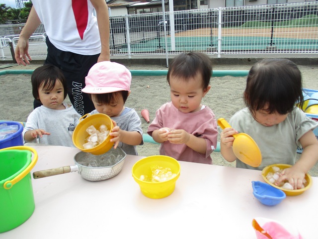 水着になって砂あそびをしたよ。みんなで大きなお山を作ったよ!