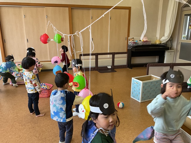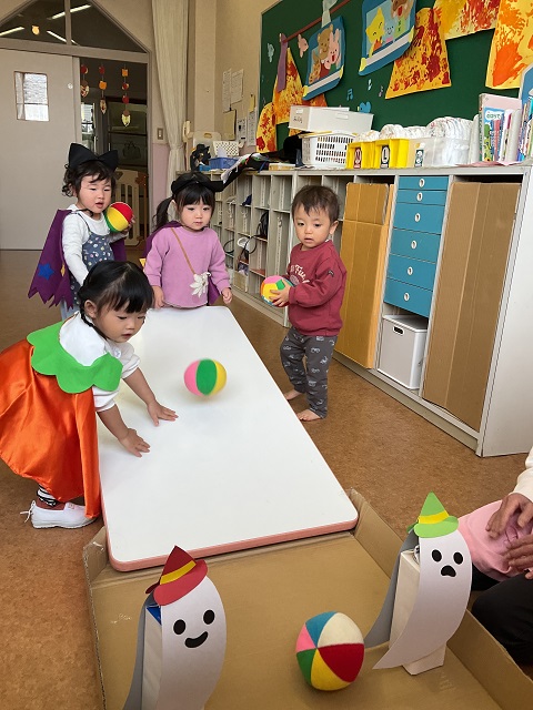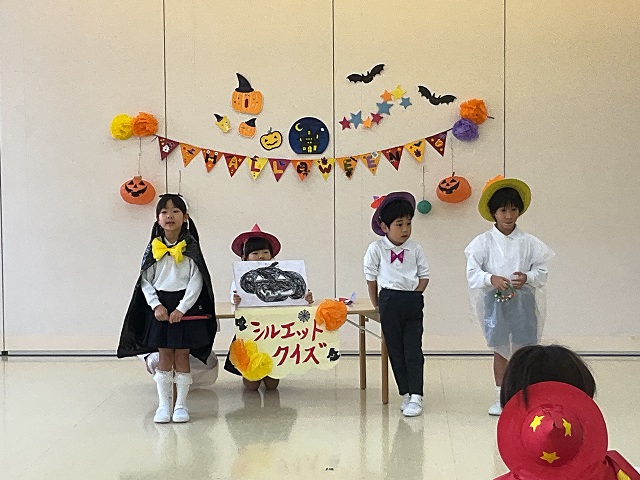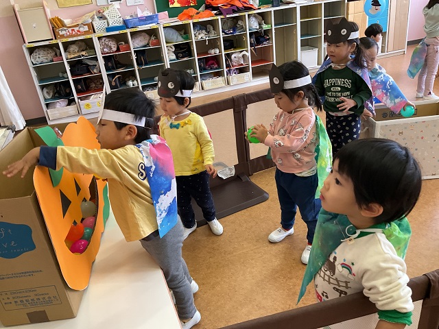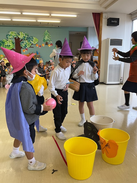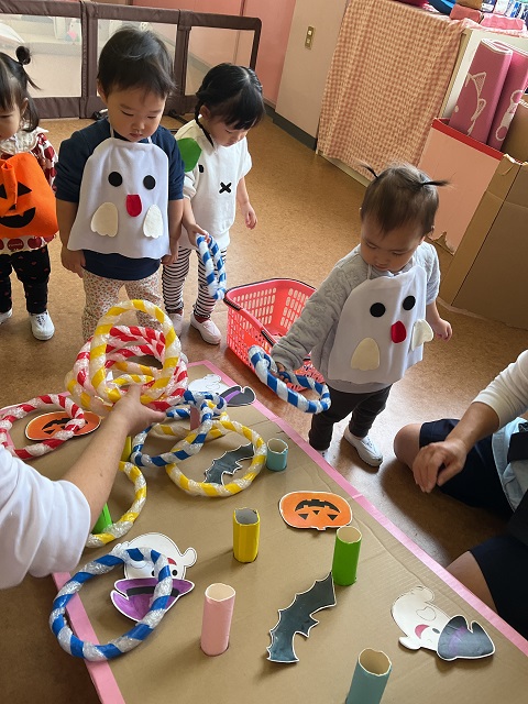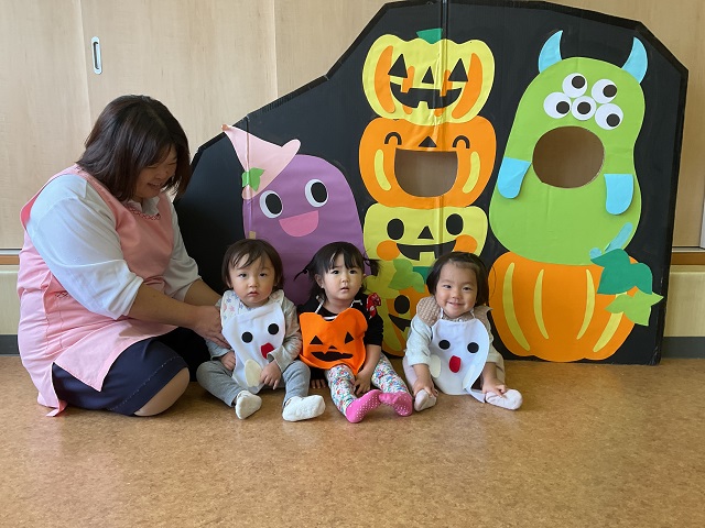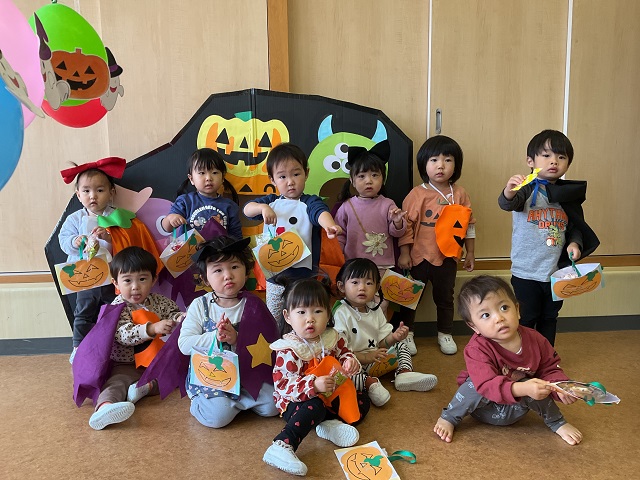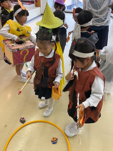 ハロウィンパーティーでは年長組が考えたシルエットクイズ、目玉ボール投げゲー ム、お化け釣りゲームをクリアーし、 お菓子をもらいました。とってもうれし そうでしたよ。小さいクラスの子ども達も変装をして「はい、ポーズ!」