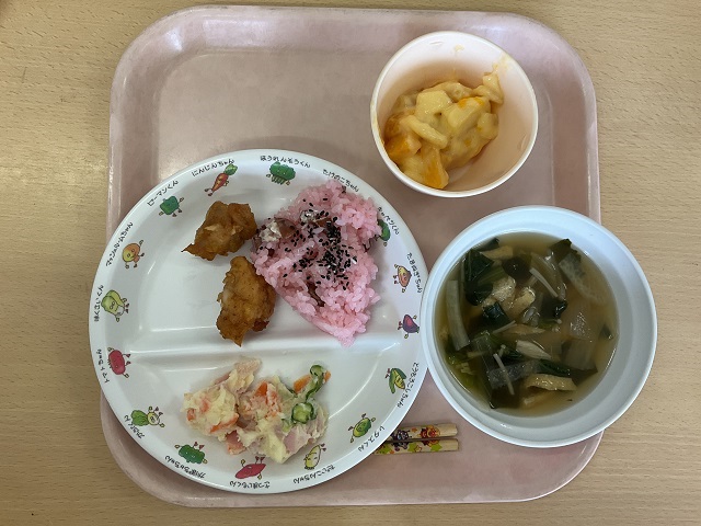 給食はお赤飯やからあげ、デザートなど美味しい祝い膳をいただきました。これからも小鳩の子ども達が健康ですくすく育ちますように!