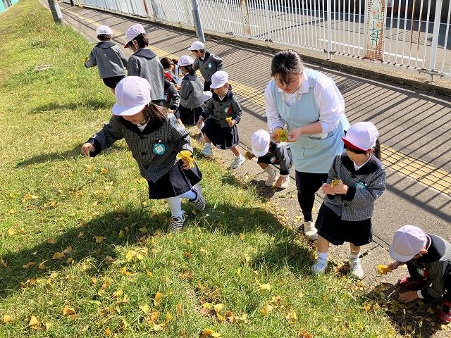 白竜公園に葉っぱを拾いに行ったり、お家からいろんな自然物を持って来ていただたりしたものを使って“秋のみのりごっこ”を楽しんでいます。